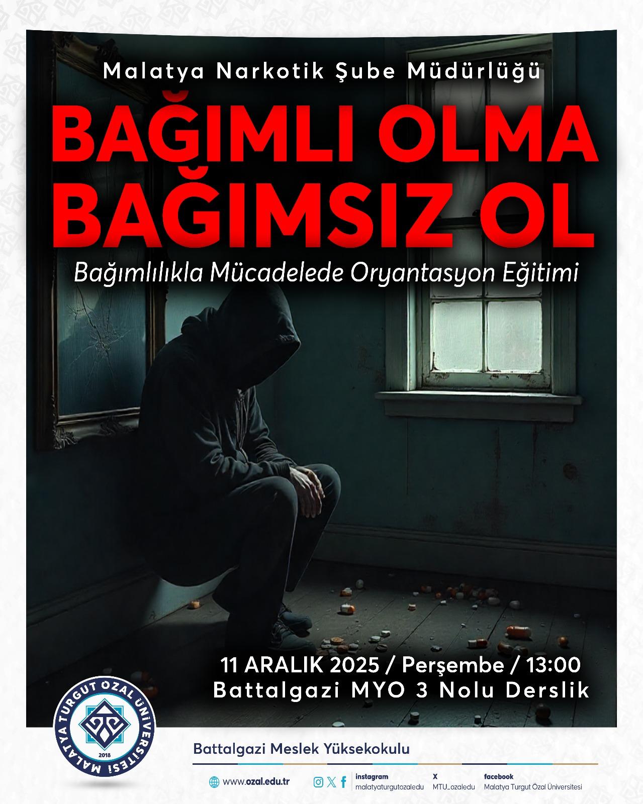 Malatya Turgut Özal Üniversitesi Battalgazi Meslek Yüksekokulu’nda, gençleri bağımlılıktan korumaya yönelik önemli bir etkinlik gerçekleştirilecektir. Malatya Narkotik Şube Müdürlüğü tarafından düzenlenen “Bağımlı Olma, Bağımsız Ol – Bağımlılıkla Mücadelede Oryantasyon Eğitimi” kapsamında, öğrenciler bilinçlendirme ve farkındalık çalışmalarına katılacaktır.